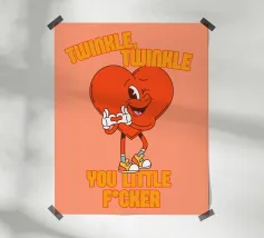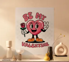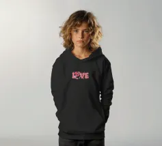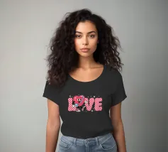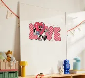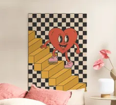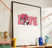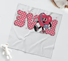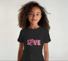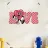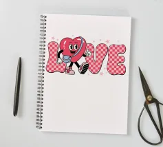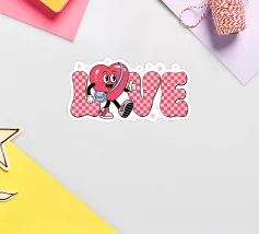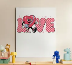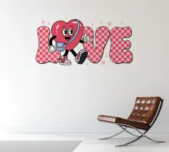 A cheerful heart character is incorporated into the word "LOVE," adorned with a pink checkered pattern. Stars surround the playful design.