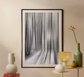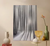 Foresta invernale astratta con alberi alti e slanciati che si fondono in linee verticali grazie alla sfocatura del movimento. I toni del grigio e del bianco e la luce soffusa creano un'atmosfera tranquilla, quasi onirica, ricca di profondità ed eleganza.