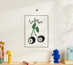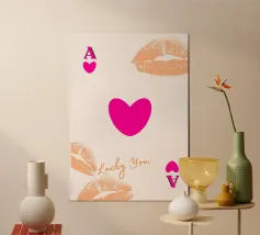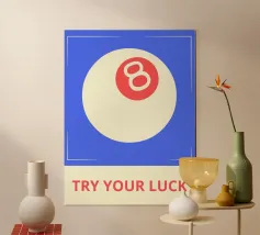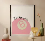 Un cerchio rosa che ricorda una palla da biliardo presenta un "8" al centro e la frase "Lucky you" scritta in caratteri scherzosi. Il disegno trasmette un senso di divertimento e fortuna.