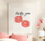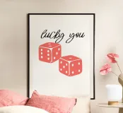 Due dadi rossi sono posizionati sotto la frase giocosa "lucky you" scritta in corsivo. Il design combina la semplicità con un messaggio positivo e stravagante.