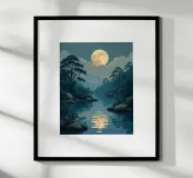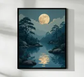 Questa accattivante opera d'arte ritrae un sereno paesaggio notturno, dominato da una magnifica luna piena che proietta il suo bagliore radioso su acque calme e di un blu intenso. Il riflesso della luna brilla sulla superficie, creando un percorso di luce morbida e dorata che conduce l'occhio nelle profondità dell'immagine. Su entrambi i lati dell'acqua, lussureggianti sagome scure di alberi antichi e fitte chiome si ergono dalle sponde rocciose, incorniciando la scena tranquilla. Sullo sfondo, strati di montagne nebulose e avvolte dalla foschia si ritirano in lontananza sotto un vasto cielo punteggiato di nuvole, aggiungendo un'atmosfera di pace e mistero. La fresca atmosfera del