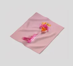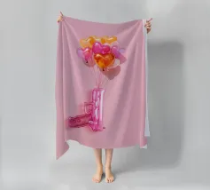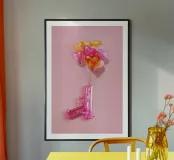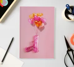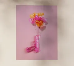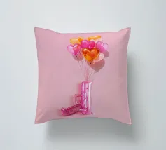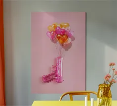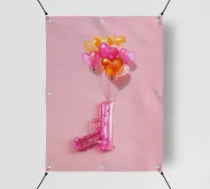 Un'opera d'arte creativa con una pistola giocattolo gonfiabile rosa legata a un bouquet di palloncini a forma di cuore nei toni del rosa, dell'arancio e dell'oro. Su uno sfondo rosa pallido, l'immagine combina elementi ludici e provocatori e trasmette il messaggio "Make love, not war" (fate l'amore, non la guerra) con un tocco di pop art. Il contrasto tra la pistola giocattolo e i palloncini a forma di cuore conferisce all'immagine una prospettiva unica sull'amore e la pace e la rende un'attrazione per gli amanti della decorazione moderna.