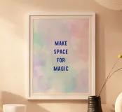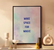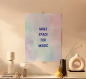"Fai spazio alla magia" in caratteri blu su uno sfondo acquerellato pastello con una sfumatura di colore dall'azzurro al rosa. Un design onirico e creativo, pieno di leggerezza, ispirazione e delicata auto-riflessione.