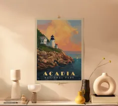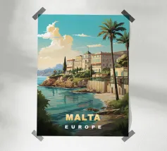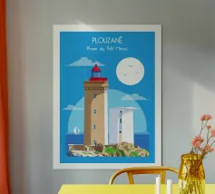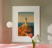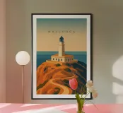 Poster di viaggio minimalista con il bellissimo faro di Faro de Formentor per tutti coloro che amano l'isola spagnola di Maiorca con il suo splendido paesaggio. Design decorativo per le vacanze estive per tutti gli amanti della Spagna e i viaggiatori del Mediterraneo.