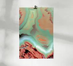 I motivi vorticosi di arancione, blu e marrone scorrono su uno sfondo verde chiaro, creando una composizione dinamica e fluida. I colori si mescolano e si fondono senza soluzione di continuità, evocando l'aspetto di superfici marmorizzate.