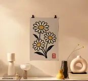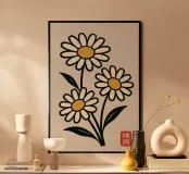 Un'opera d'arte minimalista nello stile delle tradizionali stampe xilografiche giapponesi. Tre margherite stilizzate si ergono erette e fiere su uno sfondo beige. I contorni netti e neri, la tavolozza di colori caldi con i centri dei fiori gialli e il sigillo Inkan rosso nell'angolo conferiscono al motivo un mix armonioso di grazia naturale ed estetica dell'Estremo Oriente. Ideale come decorazione murale per gli amanti del design zen, del Giappone vintage e della grafica floreale.
