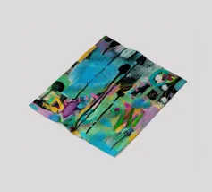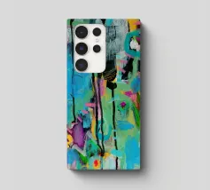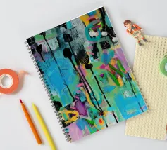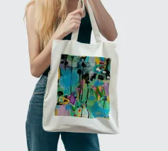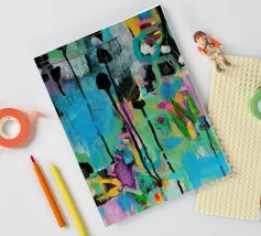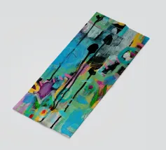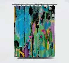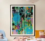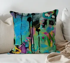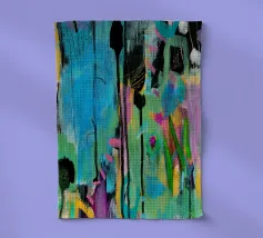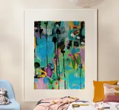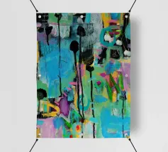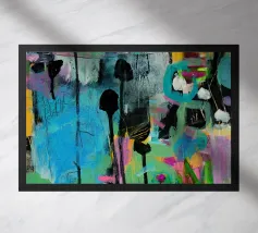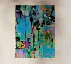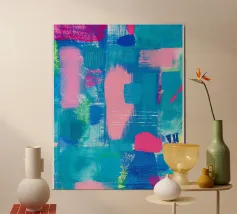 Vibrante dipinto astratto con un mix dinamico di audaci pennellate nere, blu tenue e rosa energico su una tela strutturata. L'opera presenta una complessa stratificazione di colori, tra cui spruzzi di giallo e accenni di verde, creando una composizione visivamente ricca e accattivante. L'uso di colori contrastanti e di diverse tecniche di pennello aggiunge profondità e intensità all'opera, rendendola ideale per gli interni moderni che cercano un tocco di espressionismo astratto.