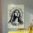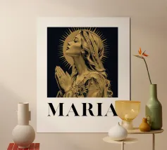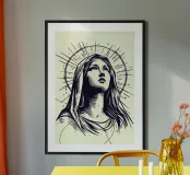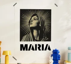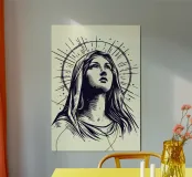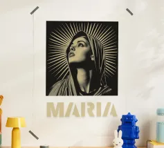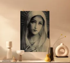 Maria è raffigurata con un'espressione di serenità e riverenza, con lo sguardo rivolto verso l'alto. Linee radianti formano un'aureola intorno alla sua testa, esaltando il tono sacro e spirituale dell'immagine.