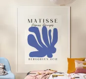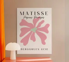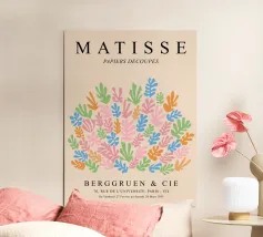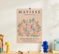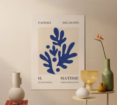 Grandi lettere in grassetto scrivono "Matisse" sopra una forma organica blu che ricorda una pianta o una forma astratta. Il testo "Papiers Découpés" suggerisce un'attenzione particolare all'arte della carta tagliata, con la scritta "Berggruen & Cie" in basso.