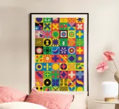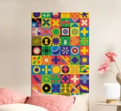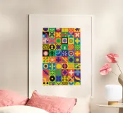 Un motivo complesso e vivace composto da una griglia di piastrelle geometriche, ognuna con un disegno e una combinazione di colori unici, che creano una matrice visiva sorprendente.
