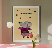 Scopri il poster personalizzabile 'Mausig', perfetto per decorare la stanza dei bambini. Con un adorabile topolino vestito a righe e cuori, questo poster porta gioia e personalità in ogni ambiente.