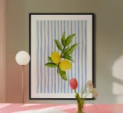Un poster sofisticato e molto vivace che presenta una dettagliata illustrazione ad acquerello di un ramo di limone fresco, completo di due limoni gialli dai colori vivaci e di un ricco fogliame verde. Il centrotavola botanico è collocato su uno sfondo dinamico e massimalista di ricco blu francese e strisce verticali bianche, il tutto reso con una finitura pittorica morbida e strutturata. L'audace combinazione di colori blu e giallo brillante crea un effetto sorprendente e allegro. Questo poster digitale di qualità superiore (7000x5000 pixel, 300 dpi) garantisce i colori ricchi e miscelati della frutta acquerellata e la texture vibrante delle strisce.