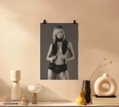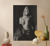 Una giovane donna seduta, in posa in topless con guanti neri e gonna corta