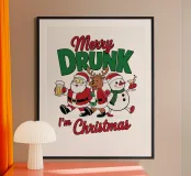 Babbo Natale, una renna e un pupazzo di neve camminano gioiosamente insieme, tenendo in mano dei drink, con la scritta "Merry Drunk I'm Christmas" sopra di loro. La scena festosa è ambientata su uno sfondo verde, che cattura uno spirito natalizio umoristico.