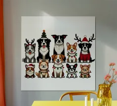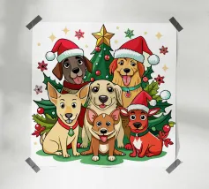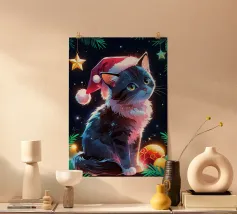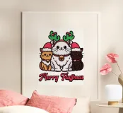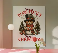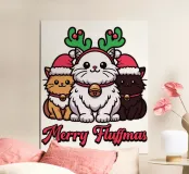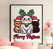 Tre adorabili gatti vestiti in abiti natalizi diffondono l'allegria delle feste, con il gatto centrale che indossa festose corna da renna. Le loro espressioni allegre si abbinano al testo "Merry Fluffmas" sotto di loro, rendendolo un delizioso disegno a tema natalizio.