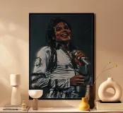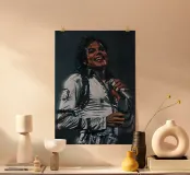"Una cantante con i capelli ricci, che indossa una giacca e una cintura d'argento, tiene un microfono e canta con un grande sorriso, emanando energia e carisma",
