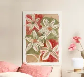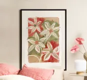 Un astratto moderno e minimale di linee e forme di delicati fiori bianchi con accenti rossi e verdi si staglia su uno sfondo verde e rosso tenue, creando una miscela armoniosa di colori. Le linee morbide e fluide evidenziano le forme eleganti dei petali.