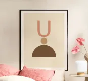Forme geometriche in tonalità tenui formano una composizione astratta. Una forma a U, un cerchio e un semicerchio creano un design minimalista.