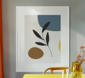 Una composizione minimalista presenta forme astratte nei toni del blu, del marrone e del giallo, abbinate a un semplice elemento botanico nero. Le linee pulite e la palette di colori tenui creano un'estetica moderna e naturale.