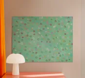 Questa immagine presenta un motivo astratto con un morbido sfondo verde mare. Sulla superficie sono disseminate numerose forme ovali irregolari in vari colori pastello, tra cui tonalità di rosa, arancione, giallo, verde e viola. Gli ovali sembrano dipinti a mano con pennellate visibili che danno consistenza alle forme. L'effetto complessivo è giocoso e stravagante, e ricorda le bolle che galleggiano dolcemente in un tranquillo ambiente acquatico o i coriandoli colorati sospesi a mezz'aria. Nell'angolo in basso a sinistra è presente una firma che indica il marchio dell'artista.