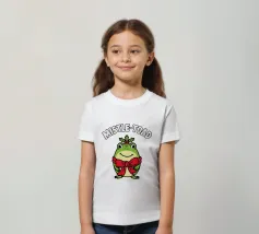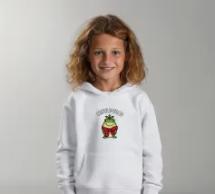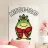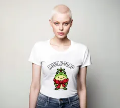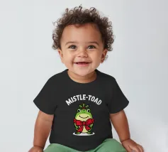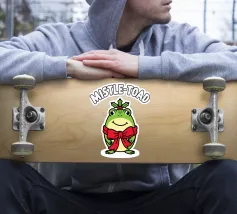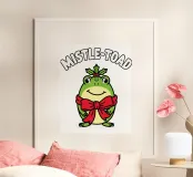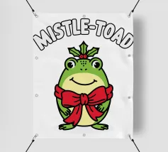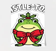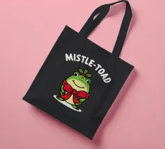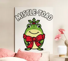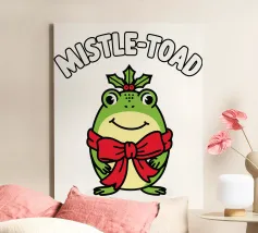 A cheerful green toad is adorned with a festive red bow, sitting happily beneath the words "Mistle-Toad" The scene suggests a playful holiday theme, with mistletoe positioned above the toad's head.