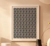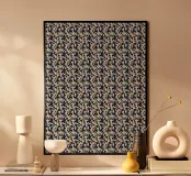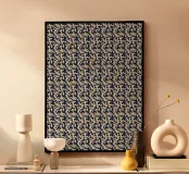 Un motivo ripetuto presenta forme astratte beige su uno sfondo blu scuro, creando un senso di simmetria e ritmo. Il design evoca un'estetica moderna e minimalista.