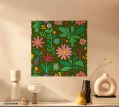 Un delizioso e morbido motivo di fiori rosa e gialli è sparso su un ricco sfondo verde scuro. Lo stile è delicato e pittorico e conferisce al disegno floreale un'atmosfera calda e leggermente vintage, bella e confortante.