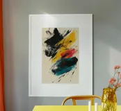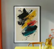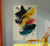 Dinamica composizione astratta caratterizzata da pennellate strutturate in nero deciso, giallo vibrante, rosso intenso e verde acqua su uno sfondo beige neutro. L'energica pennellata crea un senso di movimento e di espressione artistica contemporanea.