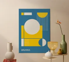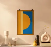 Questo poster moderno combina forme chiare con un'armoniosa palette di colori caldi come l'ocra, il giallo e il blu brillante. Un design minimalista di forte impatto, ideale per soggiorni, uffici o ambienti creativi. Il gioco di cerchi e rettangoli crea equilibrio e calma con un tocco retrò.
