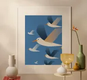 Illustrazione minimalista e geometricamente ridotta di gabbiani in volo. Le forme chiare, le aree di colore decise e il contrasto tra il blu freddo e gli accenti caldi trasmettono leggerezza, dinamismo e libertà. Un motivo moderno e senza tempo per chi cerca calma e movimento nelle proprie pareti.