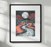 Un paesaggio sereno che raffigura un fiume tortuoso che scorre in un campo illuminato dalla luna. Due alberi spogli si ergono alti su entrambi i lati, proiettando lunghe ombre. Il cielo è pieno di stelle scintillanti e la luna piena illumina la scena.