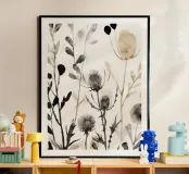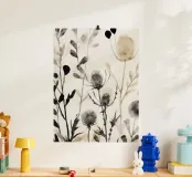 Uno studio lunatico di cardi selvatici reso con un acquerello espressivo simile all'inchiostro. I toni neutri del seppia, del carbone e del tortora si fondono con morbide silhouette botaniche e forme nitide. L'equilibrio tra delicatezza e sfida cattura la tranquilla resilienza della flora selvatica, raffinata ma indomita.