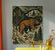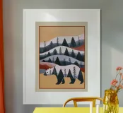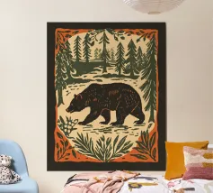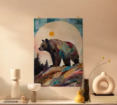 Stampa artistica con cornice in legno raffigurante un orso stilizzato tra paesaggi montani, ideale come decorazione per soggiorni moderni, uffici o camere. Realizzata con materiali di alta qualità e finiture curate, questa opera d'arte aggiunge un tocco naturale e contemporaneo agli ambienti, perfetta anche come regalo originale per amanti della natura e dell'arte.