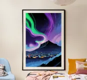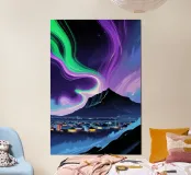 Una splendida rappresentazione di una montagna imponente circondata dal bagliore luminoso dell'aurora boreale. Le luci verdi e viola scorrono con grazia nel cielo notturno stellato, fondendosi perfettamente con la silhouette della montagna. Il dipinto digitale emana tranquillità, mostrando il fenomeno mozzafiato della natura. Questo pezzo cattura la meraviglia di una notte d'inverno sotto la magica aurora boreale, perfetto per gli amanti dell'arte celeste e del paesaggio.
