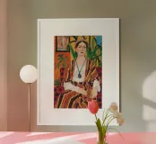 Ritratto di una donna vestita con abiti ricchi di motivi, colorati e stratificati, ornata di gioielli, che emana una sicurezza artistica e mondana.