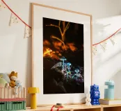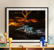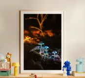 I loro cappelli emettono una delicata tonalità verde-azzurra, illuminando le foglie circostanti e il terreno umido. Minuscoli puntini di luce sembrano librarsi nell'aria, come se i funghi fossero piccole lanterne che guidano il cammino. L'intera scena sembra mistica e ultraterrena, trasformando la notte in un tranquillo e luminoso paese delle meraviglie.