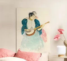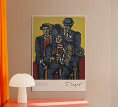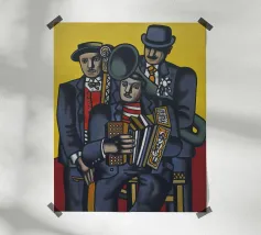 I musicisti sono raffigurati mentre suonano vari strumenti con uno stile dinamico e astratto. I colori pastello si fondono intorno alle figure, creando un'atmosfera vivace ed energica.