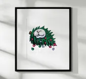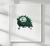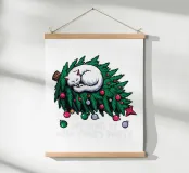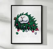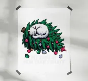 Un gatto bianco si accoccola e dorme su un albero di Natale inclinato orizzontalmente e ornato da decorazioni colorate. Sotto l'albero, il testo recita: "Il mio tipo di festa di Capodanno".