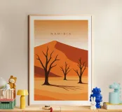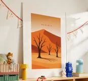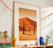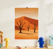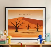Disegno di viaggio minimalista della Namibia con Deadvlei o Sossusvlei nel Namib. Questo motivo tipico del paesaggio africano è perfetto per tutti i viaggiatori della Namibia che amano le dune di sabbia e i pittoreschi alberi di cammello.
