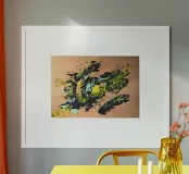 Quest'opera è realizzata su un foglio di cartone senza colorazione, lasciando visibili sullo sfondo le fibre di legno che la compongono. L'obiettivo è quello di presentare un'opera dipinta che mantenga un aspetto grezzo, offrendo un supporto che evochi la sua origine naturale. Il risultato è un'armonia e una maggiore facilità di integrazione in diversi stili di arredamento.