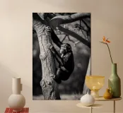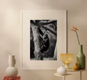 Immaginate una suggestiva scena in bianco e nero di una scimmia che si arrampica con grazia su un albero nodoso. La scimmia, con i suoi arti agili e il suo volto espressivo, è in pieno movimento, con una mano che afferra un ramo spesso mentre il suo corpo si protende verso il tronco. La corteccia strutturata contrasta nettamente con la morbidezza della pelliccia della scimmia. Le ombre giocano in modo drammatico sulla scena, esaltando i contorni dell'albero e la forma della scimmia. L'atmosfera sembra quasi eterea, evocando un senso di immobilità e concentrazione in mezzo alla natura selvaggia. I rami in alto creano un baldacchino, filtrando la luce e aggiungendo profondità alla composizione.