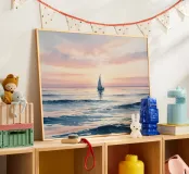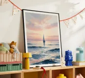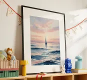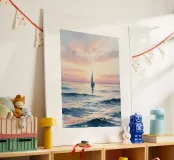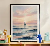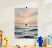 Una fuga pacifica su tela. Questo paesaggio marino acquerellato cattura il dolce movimento delle onde sotto un cielo pastello, con una barca a vela solitaria alla deriva verso l'orizzonte. Perfetto per aggiungere un tocco sereno e costiero a qualsiasi spazio.