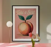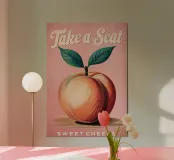 Entrate in un mondo di fascino stravagante con la nostra stampa d'arte sulla pesca vintage "Take a Seat, Sweet Cheeks". Questo delizioso poster presenta una bella pesca con due foglie verdi e vibranti, che trasmette un'atmosfera nostalgica e illustrata a mano. Lo sfondo rosa tenue e sbiadito aggiunge un fascino antico, rendendolo un pezzo perfetto per aggiungere un tocco di calore e giocosità a qualsiasi spazio. L'elegante scritta "Take a Seat" è posizionata con grazia sopra la pesca, mentre la scritta "Sweet Cheeks" è ancorata in basso, creando un messaggio spensierato e invitante.