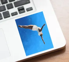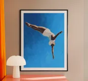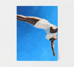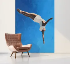 Questo potente motivo mostra una donna in costume da bagno bianco, il cui corpo proteso cade in un blu profondo e ricco - libero, forte, senza peso. La composizione irradia libertà, movimento e autodeterminazione. Perfetto per gli interni moderni, per le pareti di rappresentanza e per chi associa l'arte all'ottimismo e alla leggerezza.