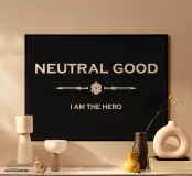 Il motivo mostra le parole "Neutral Good" sopra lo slogan ispiratore "I Am the Hero". Il dado D20 al centro è affiancato da due spade. Questo disegno celebra l'eroe che agisce secondo il proprio cuore, indipendentemente dalla legge o dal caos: un classico tra i personaggi dei giochi di ruolo.