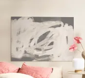 Pennellate astratte, gestuali e sovrapposte in una combinazione di colori neutri. Bianco sporco, toni caldi del grigio, beige.