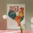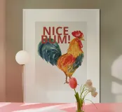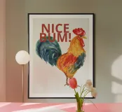 Un gallo colorato è raffigurato con vivaci colori rossi, arancioni e blu, completati dal testo scherzoso "NICE BUM!" a caratteri cubitali. L'opera d'arte combina l'umorismo con una colorazione vivace che la rende di grande impatto visivo.