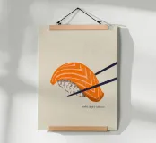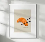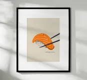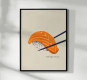 "Sushi Nigiri Salmon" mette in risalto l'arte della cucina giapponese con una vibrante fetta di salmone fresco appoggiata su un riso delicato. Questo poster minimalista celebra la semplicità e l'eleganza, evocando il fascino irresistibile dell'autentico sushi artigianale.