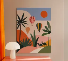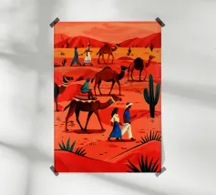 Questo dipinto illustra un gruppo di nomadi con cammelli che attraversano un deserto. La scena è ambientata su uno sfondo di dune rosse e vegetazione rada, che enfatizza l'ambiente aspro ma bellissimo.