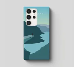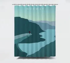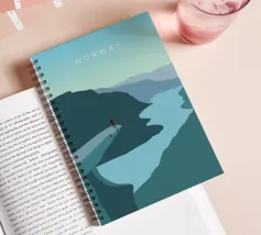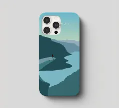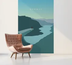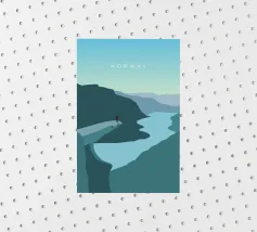 Design minimalista della Norvegia con un noto affioramento roccioso in un fiordo sulla costa norvegese con montagne sullo sfondo. Tipico paesaggio scandinavo e impressionante scenario montano nel sud della Norvegia.